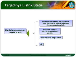 Dokumen ini membahas tentang listrik statis, termasuk muatan listrik, gejala penarikan dan tolakan antar benda bermuatan, serta hukum Coulomb yang menjelaskan interaksi antara muatan. Selain itu, juga dijelaskan tentang medan listrik, kuat medan listrik, dan fluks listrik dalam konteks hukum Gauss. Ringkasan ini memberikan pemahaman dasar mengenai fenomena listrik statis dan prinsip-prinsip fisika yang mendasarinya.