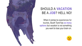 This document discusses using artificial intelligence to help tourists in South Tyrol find inspiring experiences that match their interests. By accessing open data through APIs, an algorithm can learn a tourist's tastes from their photos and suggest customized activities, events and points of interest. This makes the process of choosing experiences into an experience in itself. The goal is to connect people to places in the region through an app called Lit, helping tourists get the most out of their vacation without losing their brain in the process.