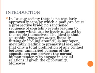 Tausug society traditionally did not allow for open courtship between unmarried men and women. Men would indirectly express interest through letters, glimpses of women from a distance, or poetic metaphors. By the 1980s, courtship became less conservative, with men escorting women in public or visiting them at home with chaperones. Modern courtship among Tausug involves initial digital communication through texting and social media, followed by in-person dates, sharing activities, and gift giving.