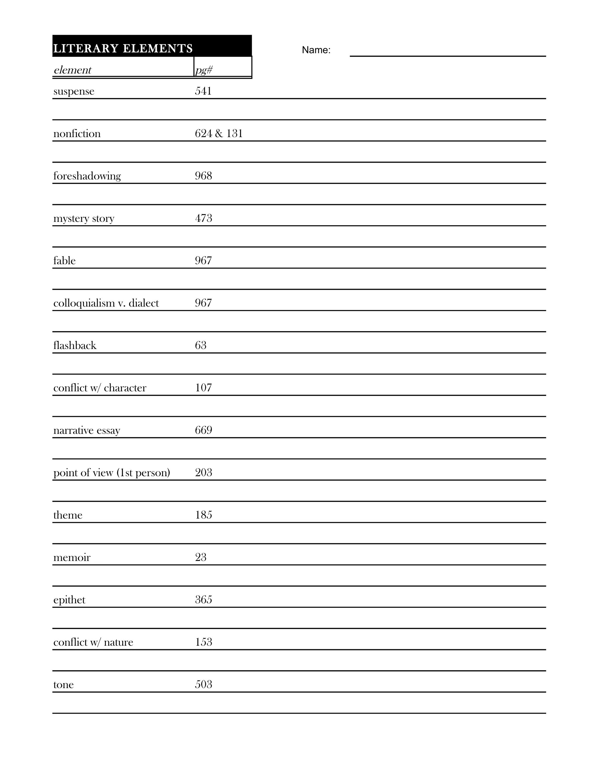 This document lists various literary elements and their corresponding page numbers. It includes elements such as suspense on page 541, nonfiction on pages 624 and 131, foreshadowing on page 968, and a mystery story on page 473. It also notes elements like fable on page 967, colloquialism versus dialect on page 967, and flashback on page 63.