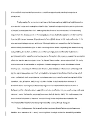 Service learning has become widely used in education from K-12 through undergraduate programs. There are different types of service learning interventions that can be used, such as required service learning courses or optional additional credit courses. Research shows that service learning is most effective when it is a required part of a course, as this ensures student participation and opportunities for reflection. When service learning is required, studies have found benefits such as increased civic engagement, empathy, and academic achievement for students of all ages. Undergraduate programs may be an ideal time for service learning, as it can encourage civic engagement in young adults and help support career exploration and development of personal views. However, more research is needed to understand how the goals and types of service learning projects impact
