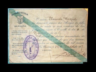 A aparición donacionalismo Local onde se fundou a primeira Irmandade da no 18/05/1916. Na placa pódese ler: O 18 de maio de 1916 fundouse aquí a primeira das IRMANDADES DOS AMIGOS DA FALA ao impulso dos nacionalistas galegos Antón e Ramón Vilar Ponte (1881-1936 1891-1953).