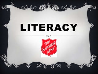 The Salvation Army is a Christian organization that aims to advance religion and provide relief from poverty. One of its programs is Mission: Literacy, which began in 2006 and aims to increase children's reading abilities and help them discover the joy of reading the Bible. The program establishes tutoring relationships and teaches reading and biblical principles. It has since expanded across the US and received positive feedback from students, inspiring others to donate books to support literacy.