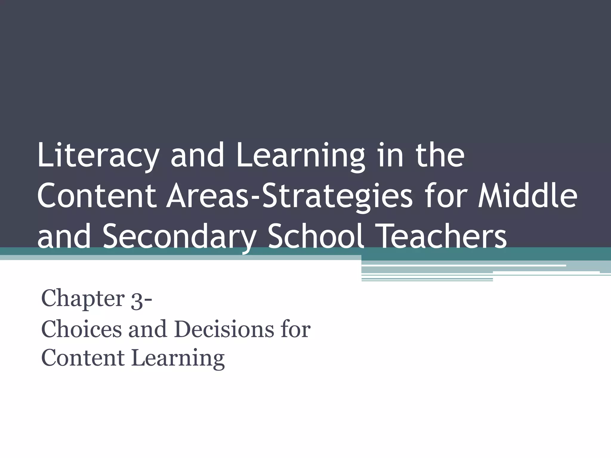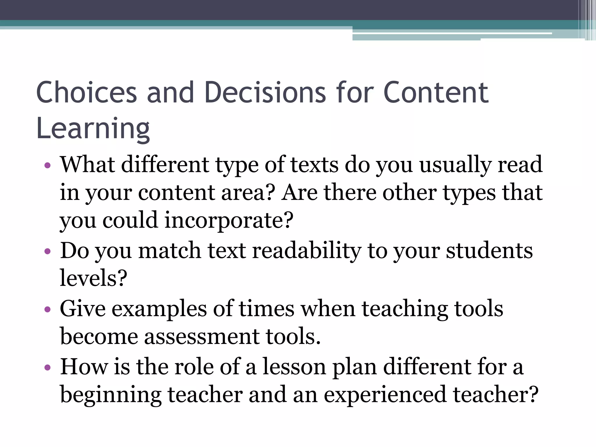 Teachers have choices in the types of texts and teaching methods used for content learning. Textbooks provide a basic overview but should be supplemented with trade books, magazines, newspapers and other sources. When selecting texts, teachers consider the readability, fairness, and how well the content and format work together for student comprehension. Teachers also make decisions about communication roles, grouping patterns, teaching tools, and assessment tools. Formative assessments help guide instruction while summative assessments evaluate learning. Lesson plans outline goals, materials, instruction, and evaluations. Experienced teachers adapt plans based on students' needs.