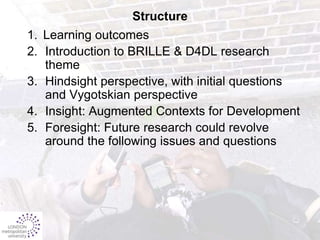 The document discusses literacy and technology enhanced learning from three perspectives: hindsight, insight, and foresight. It provides context on the BRILLE research center and discusses how Vygotsky's work on tools as mediators and the Zone of Proximal Development can provide insight into augmented contexts for development using mobile technologies. Future research questions are proposed around issues like balancing traditional assessment with collaborative learning supported by new technologies.