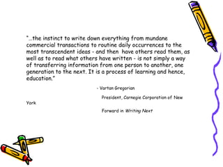 This document discusses strategies and tools to help students with reading and writing challenges. It recommends teaching specific writing strategies like planning, revising and editing. It also suggests using word processing tools, pre-writing activities, sentence combining, and process writing. Technology can help with individualization, repetition, and providing data to improve literacy. Teaching writing improves both writing and reading abilities.