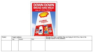 This document outlines key aspects of a product's target audience including their age, gender, role, and whether there is a problem the product aims to address. However, no specific information is provided about a product, audience, or message since the fields are blank.