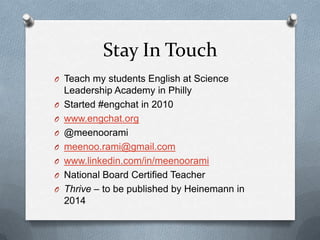 This presentation discusses literacy in a connected world and emphasizes expanding definitions of reading and writing to engage students in authentic literacy experiences using digital tools. It encourages connecting students to wider audiences through blogging, social media, and collaborating with authors. Surveys show students enjoy sharing work and collaborating using digital technologies. The presenter provides examples of reading materials and writing projects for students, and recommends teachers model literacy by sharing their own reading and writing lives.
