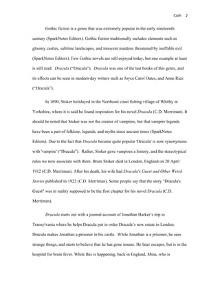 1) The document provides a literary analysis of Bram Stoker's 1897 novel Dracula, beginning with background on Stoker's life and the origins and popularity of Gothic fiction.