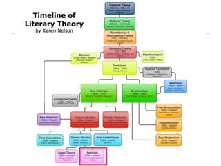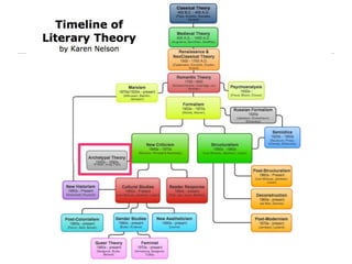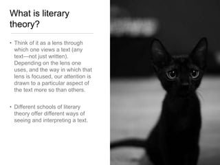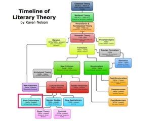 This document provides an overview of several major literary theories: reader response theory, archetypal literary criticism, feminist literary criticism, and postcolonial literary criticism. For each theory, it defines the key ideas, provides examples of how to analyze a text using that theoretical lens, and recommends further required reading materials to learn more about each approach. The goal is to introduce students to different critical perspectives they can use to interpret literary works.