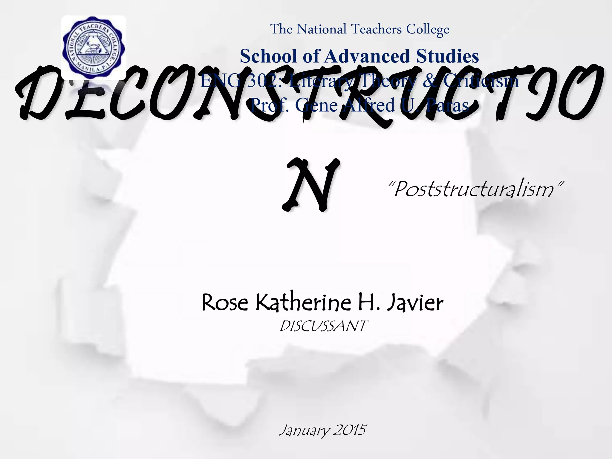 Deconstruction began in the 1960s with Jacques Derrida and other theorists who took structuralism to its logical extreme. They argued that language is unstable and meanings are uncertain. Deconstruction involves carefully analyzing texts to uncover inconsistencies and contradictions. This reveals the complex foundations that are difficult to interpret definitively. The process involves two phases - first reversing hierarchies, then neutralizing binary oppositions to arrive at undecidable meanings. Deconstruction has been applied to analyze various literary works.
