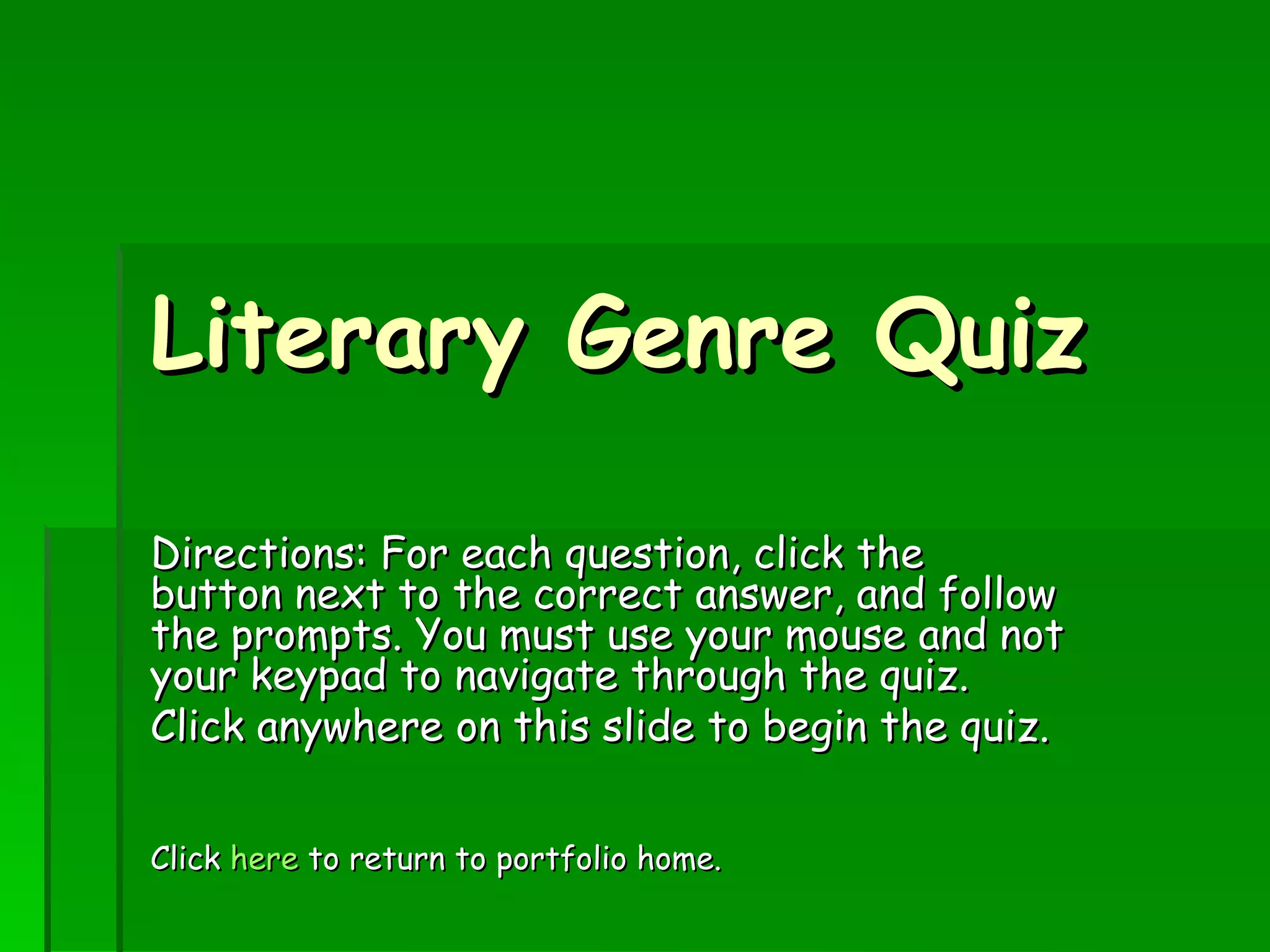 This document provides instructions and questions for a literary genre quiz. It tests the user's ability to identify different genres, including fiction genres like fantasy, poetry, and fables, as well as nonfiction. The quiz provides feedback and explanations for each question to help the user learn.