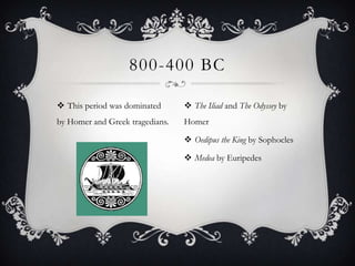 This document provides an overview of major literary movements and authors throughout history from 800 BC to the present. Some of the key periods and authors mentioned include ancient Greek writers like Homer from 800-400 BC, Roman authors like Virgil from 250 BC - AD 150, English authors from the Old English period like Beowulf from 450-1066 AD, and major figures of the Renaissance like Shakespeare from 1500-1660. The document then outlines various literary periods up to the modern era, noting defining works and authors of each movement.