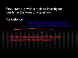 The document provides guidance on how to conduct literary research and write a research paper. It recommends starting with a focused research question and doing general research to understand available resources. The paper should show what others have said about the topic and present the writer's own perspective. Academic sources like books and articles are most appropriate to cite. Taking notes and drafting a works cited page from the beginning is advised. The document includes tips on revising, using evidence, and following assignment guidelines.