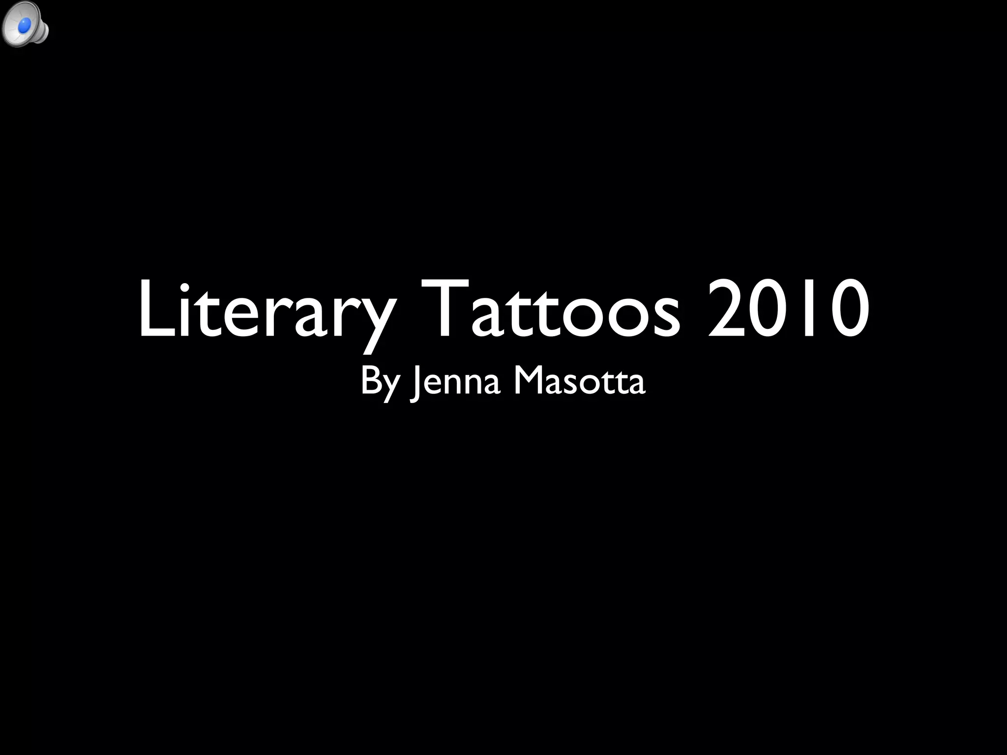 This document lists 10 literary tattoos that various people have, along with their ages and the book that inspired each tattoo. It includes tattoos of Catcher in the Rye, Twilight, The Crow, Never Die Easy: The Autobiography of Walter Payton, One Hundred Years of Solitude, The Metamorphosis, A Perfect Day for a Bananafish, the Serenity Prayer, God Bless You, Dr. Kevorkian, and Lord of the Rings. The tattoos represent both novels and short stories that have clearly made an impact on these individuals.
