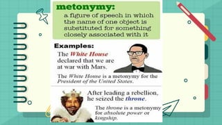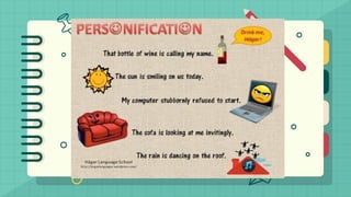 The document defines various literary techniques, including similes, metaphors, allusions, personification, metonymy, synecdoche, litotes, paradoxes, irony, and oxymorons. Each term includes a definition, example sentence, and an analogy to illustrate its meaning. These techniques enhance language by comparing, contrasting, or attributing qualities in creative ways.