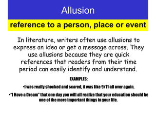 It also discusses literary elements like plot points, narrative perspective, types of conflicts, figurative language, tone and mood.