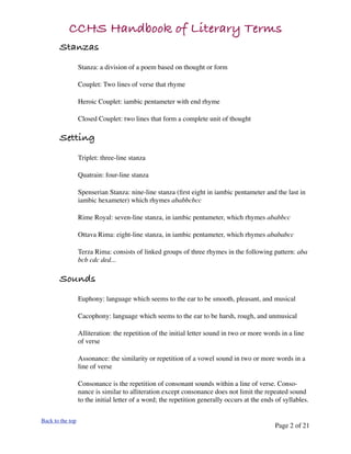 The document provides an overview of key literary elements and terms related to poetry, fiction, drama, and non-fiction. It defines common poetic devices such as rhyme, meter, figures of speech, and forms such as the sonnet. For non-fiction, it discusses elements such as objective vs. subjective truth and different types including biography and memoir. It also covers linguistic concepts like diction, syntax, and style.