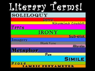 The document defines various literary terms including soliloquy, genre, rhyming couplet, farce, irony, sub-plot, imagery, blank verse, alliteration, metaphor, pun, simile, prose, and iambic pentameter. It provides descriptions of each term and examples to illustrate literary devices such as metaphor and irony.