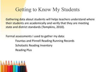 This document provides information about gathering data on students' reading levels through formal assessments. It analyzes data from three students using Fountas and Pinnell Running Records, Scholastic Reading Inventory, and Reading Plus. The data shows the students struggle with comprehension. The document discusses selecting texts using the Literacy Matrix and designing lessons to target vocabulary, fluency, and comprehension using various instructional perspectives and texts.