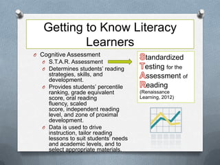 1) Standardized and non-cognitive assessments to understand students' reading abilities and interests.