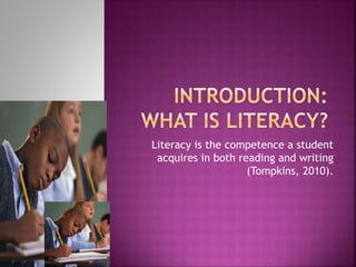 The document discusses the importance of creating a literate environment for students in pre-K to 3rd grade, emphasizing the need for tailored literacy instruction based on comprehensive assessments of each student's abilities and interests. It details various assessment methods, the selection of appropriate texts, and instructional strategies that foster critical thinking and comprehension skills. The teacher's approach included engaging themes, such as dinosaurs, to motivate students and facilitate their literacy development through both cognitive and non-cognitive assessments.