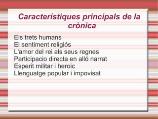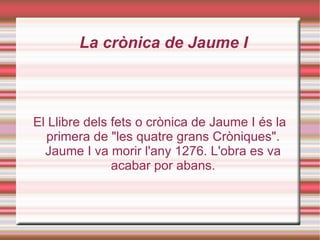 La crònica deJaume I El Llibre dels fets o crònica de Jaume I és la primera de "les quatre grans Cròniques". Jaume I va morir l'any 1276. L'obra es va acabar por abans.