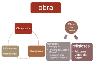 Caràcteristiques de laseua obra poètica Poemes dotats d’una visió intimista i plena de sinceritat. Escassesa de recursos retòrics. Estil directe i sec Predomina el vers decasíl.lab, en cobles (estrofes de huit versos )