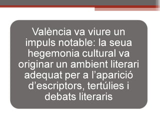 B) Econòmiques isocials : augment del comerç i les ciutats que significa l’ampliació de noves formes de pensament Durant el segle XV, València ciutat, creix dels 4.000 habitants que tenia a principis de segle, a més de 80.000 en 1483. La producció agrícola i industrial, així com el comerç, assoleix una expansió sense precedents, i durant el regnat d'Alfons el Magnànim, València es converteix en una de les capitals més florecientes d'Europa per la seva activitat cultural i financera.