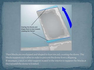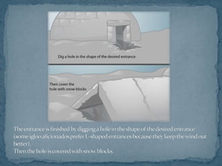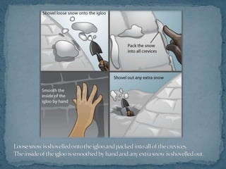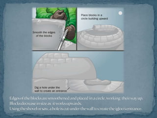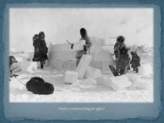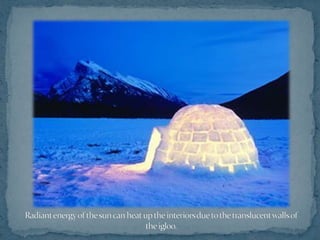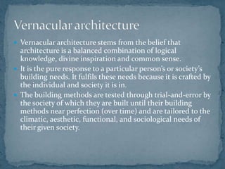 The document discusses vernacular architecture, emphasizing its role as a practical response to cultural and environmental needs, with examples from various global cultures like the Inuit and their igloos. It highlights how these building methods evolve from trial-and-error to better accommodate local climates and resources while also addressing contemporary architectural practices that merge traditional techniques with modern sustainability. The importance of cultural heritage, community, and adaptability in vernacular architecture is articulated alongside the ongoing relevance of such structures in today's world.
