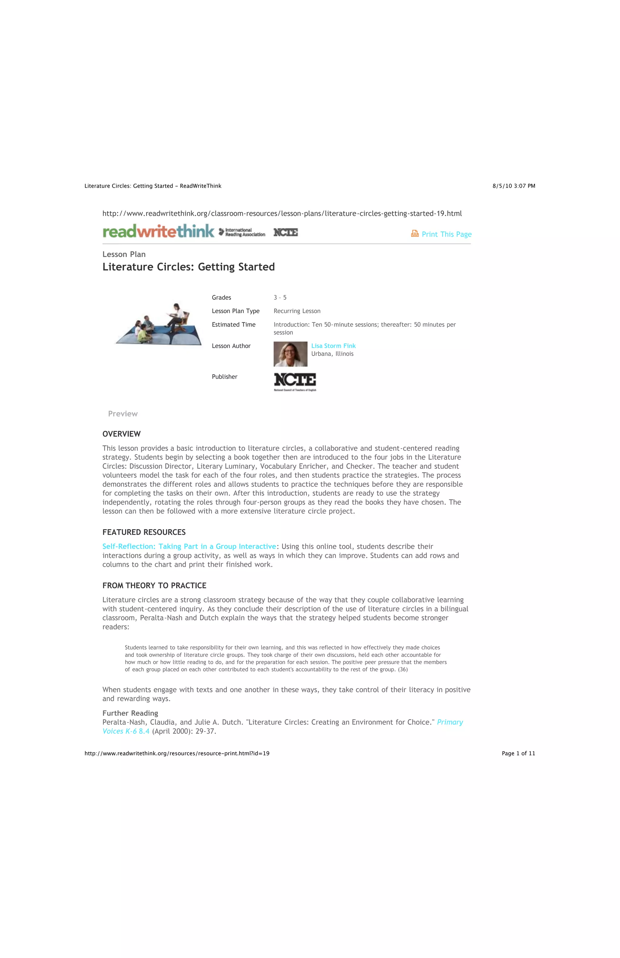 This document provides an overview of a 10-session lesson plan to introduce students to literature circles. The plan models the four main roles that students take on in literature circles: Discussion Director, Vocabulary Enricher, Literary Luminary, and Checker. Each role is demonstrated by the teacher and practiced by students. By the end of the introduction, students are prepared to participate independently in literature circles to discuss books they have chosen.