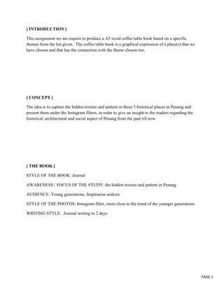 This document provides details about a project to create a photo book capturing textures and patterns in 5 historical places in Penang, Malaysia under different Instagram filters. The places chosen are Chew Jetty, Armenian Street, Mahamariamman Temple, Town Hall, and Standard Charted Bank, representing the earliest settlement to modern financial center. Photos of these places will be presented in a journal-style coffee table book to convey the history, architecture, and social aspects of Penang to young readers. The focus is on how textures and patterns in buildings reflect the culture, traditions, lifestyles, and values of past societies.