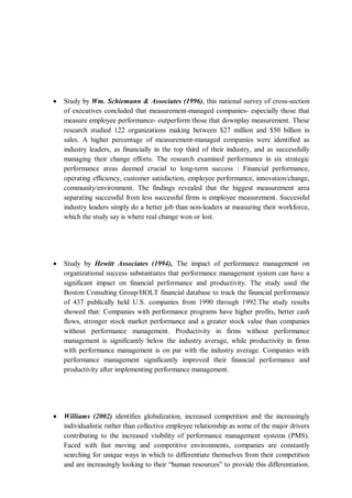 This document provides a literature review on performance management systems. It summarizes several studies that have examined the impact and effectiveness of performance management. Some key findings include: successful performance management systems are linked to positive organizational outcomes like financial performance; measurement and goal-setting are associated with better company performance; training and development practices are strongly related to perceived organizational performance; and line manager involvement and buy-in is important for effective implementation of performance management systems. The literature review covers research from 1997 to 2012.