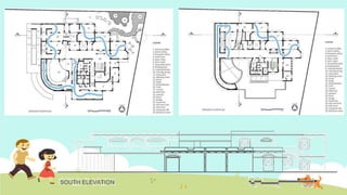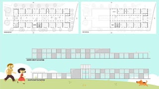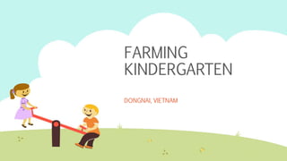 The document describes three kindergarten projects in Vietnam, India, and India. The Farming Kindergarten in Vietnam features a spiral green roof that provides food and teaches children about agriculture. It uses recycled materials and energy efficient designs. The DPS Kindergarten in India uses a modular design with classrooms opening onto a central courtyard to provide light and ventilation. The Yellow Train Kindergarten in India follows Waldorf education principles with classroom, play, and learning spaces integrated throughout the building to encourage creative and activity-based learning.