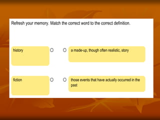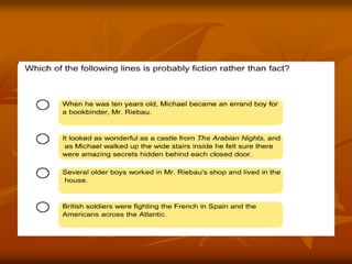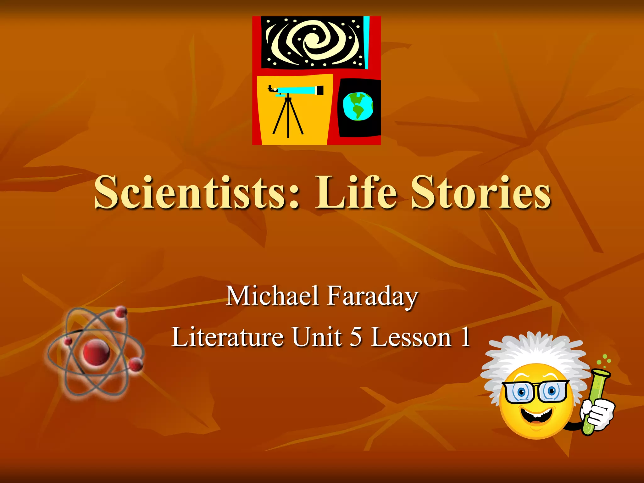 This document provides lesson objectives and instructions for students to analyze the historical facts versus fictional elements in a story about Michael Faraday. Students are asked to review pages 87-99 of a book, taking notes on the facts and fiction. They will then share their notes on a whiteboard for points. The next day's reading assignment is also provided.