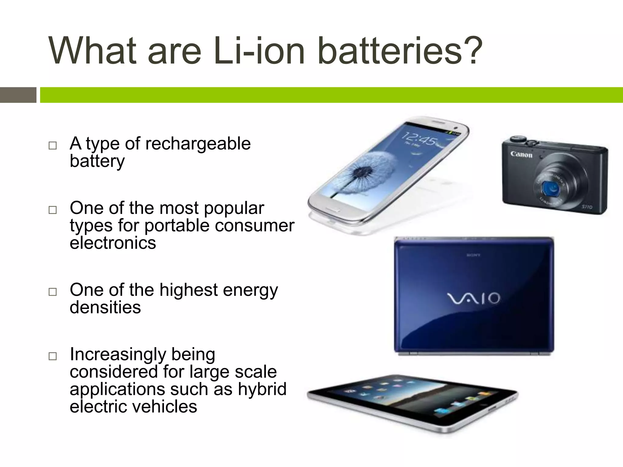Lithium-ion batteries are rechargeable batteries with high energy density, widely used in portable electronics and increasingly in large-scale applications like hybrid electric vehicles. They work through the movement of lithium ions between the anode and cathode during charging and discharging, and key properties include voltage, capacity, energy density, and safety. The Lithium Battery Explorer is a custom search tool for finding information on lithium-ion electrode materials and their properties for battery research.