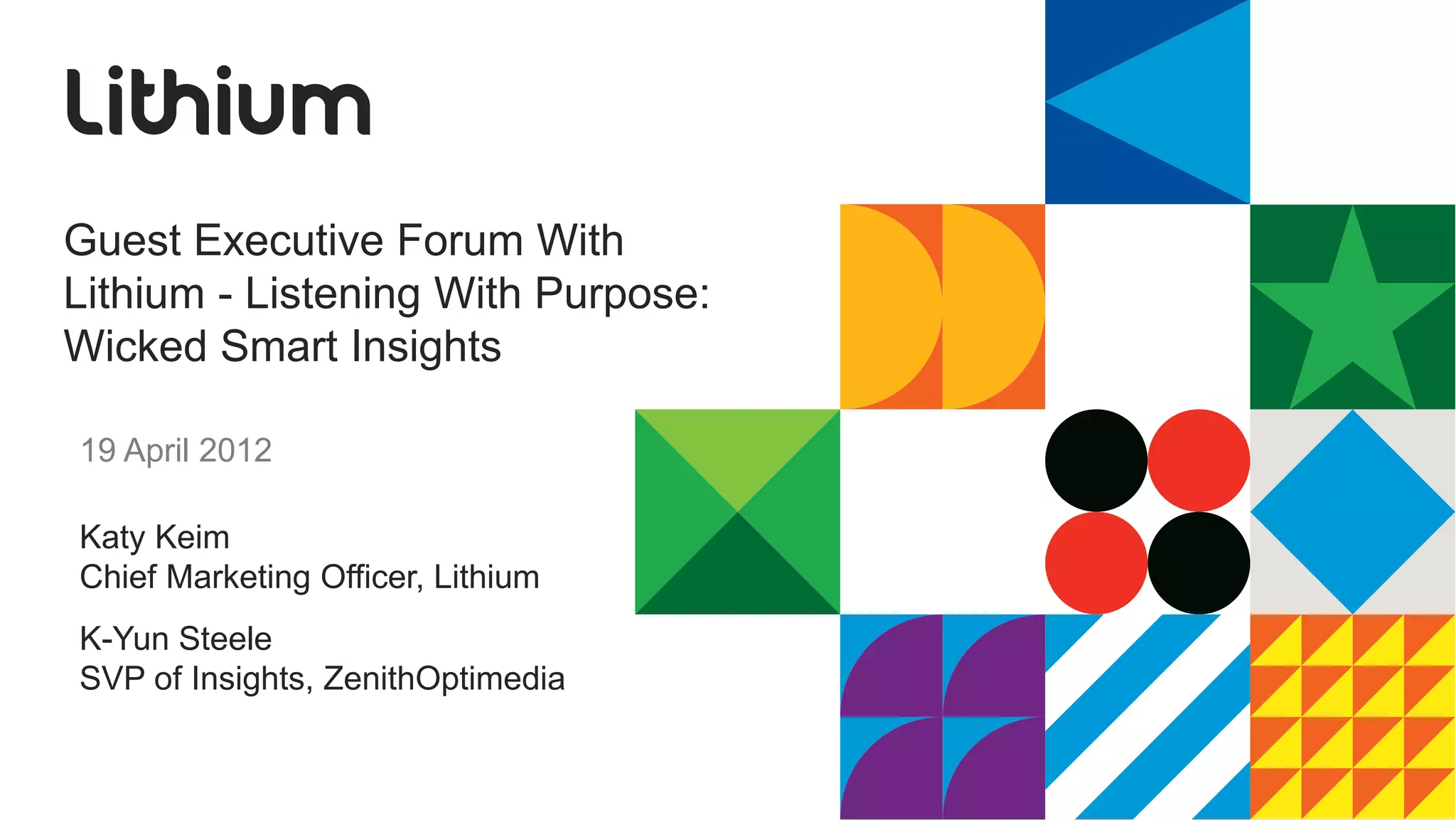 The document discusses insights from a guest executive forum by Lithium and ZenithOptimedia, emphasizing the importance of understanding social customers to enhance brand experiences. It highlights the need to engage in social listening and to leverage data for driving business impact through informed marketing strategies. Furthermore, it explores the evolving landscape of social media and big data, underscoring the significance of adapting to customer needs and trends.