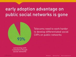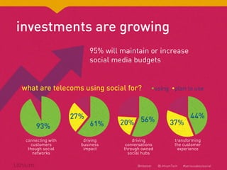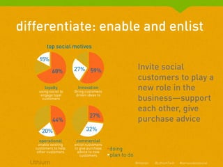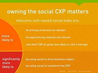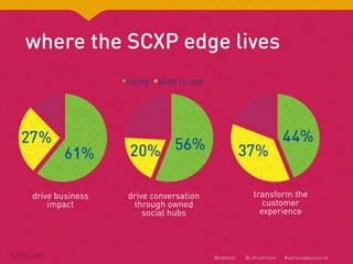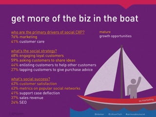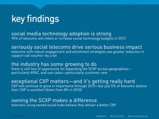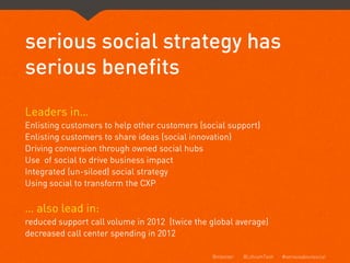 64% of companies saw call volumes go down in 2012, which is twice the global average. The document also discusses that the companies polled were ranked #1 in using social media to drive business impact, transform customer experience, drive conversion through owned social channels, enlist customers to help other customers through social support, and enlist customers to share ideas for social innovation. Additionally, the document notes that social goals and strategies were spread evenly throughout the businesses.