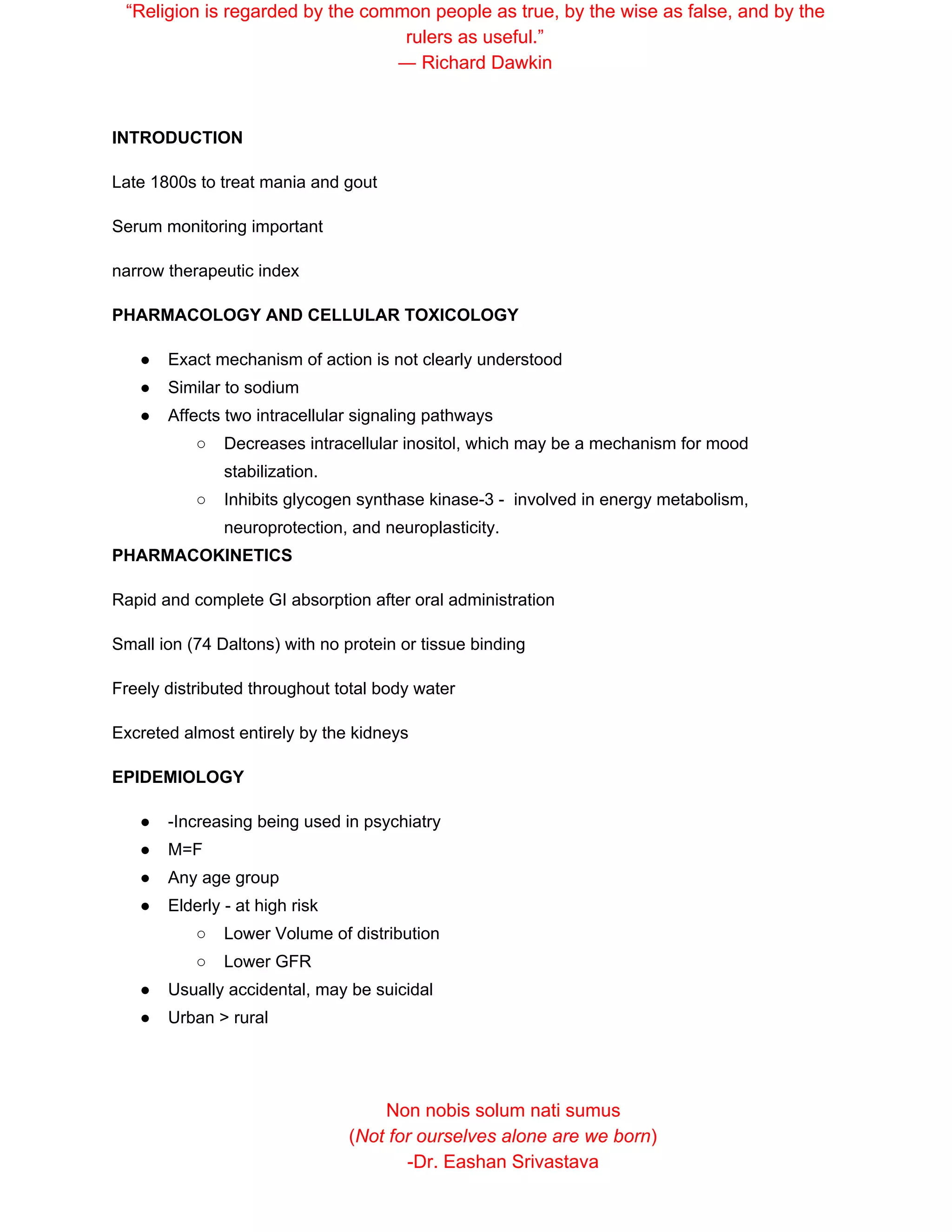 Lithium is used to treat mania and gout. Its exact mechanism of action is unclear but it affects intracellular signaling pathways related to mood stabilization and energy metabolism. It is rapidly absorbed orally and excreted by the kidneys. Toxicity symptoms vary depending on lithium levels and can include nausea, arrhythmias, neurological effects, and renal issues. Diagnosis is based on history, exam, and serum lithium concentration. Treatment involves hydration, gastrointestinal decontamination, and hemodialysis in severe cases.