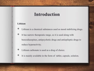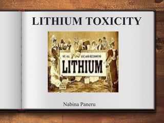 Lithium is a mood stabilizing medication used primarily for treating bipolar disorder, with a narrow therapeutic range that necessitates careful monitoring to prevent toxicity. Symptoms of lithium toxicity can range from generalized effects like nausea and dizziness to severe outcomes such as seizures and kidney failure, with both acute and chronic forms dependent on dosage and duration of use. Management includes life stabilization, symptomatic treatment, and potential interventions like hemodialysis for severe cases.