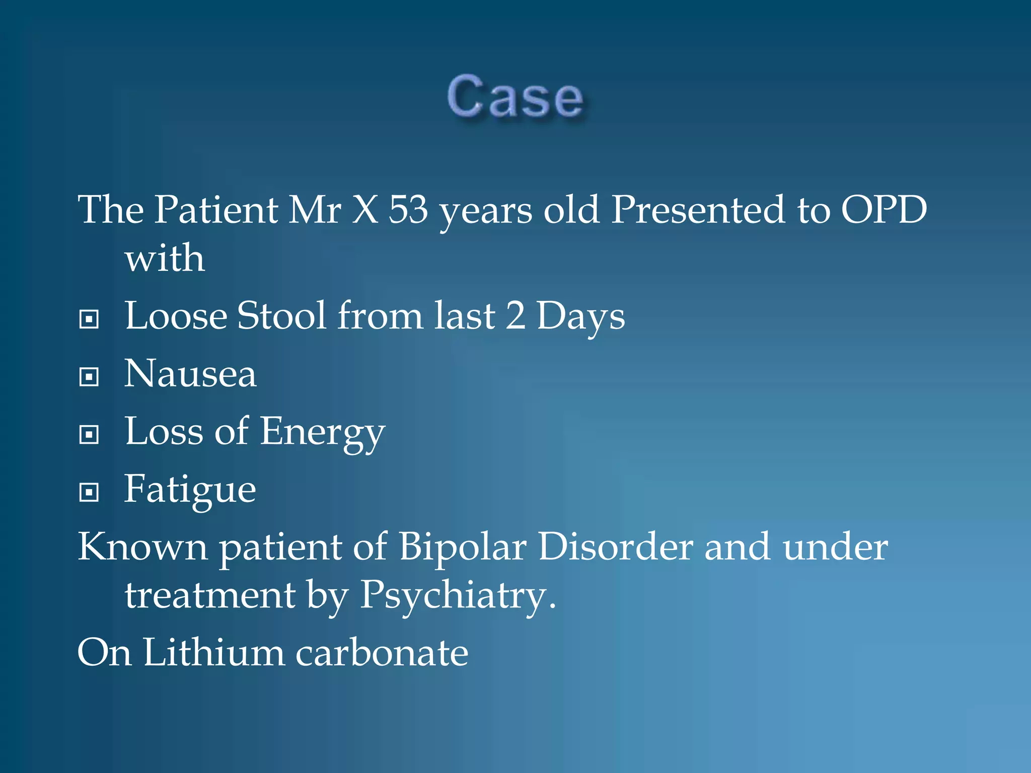 The patient, a 53-year-old man with bipolar disorder treated with lithium carbonate, presented with loose stool, nausea, fatigue, and loss of energy over the past two days. His lithium level was found to be 3.17 mmol/L, above the therapeutic range of 0.50-1.20 mmol/L, indicating lithium toxicity. He was admitted and treated supportively with IV fluids and discontinuation of lithium. His lithium level decreased to 0.68 mmol/L after 4 days and he was discharged to psychiatric care after one week.