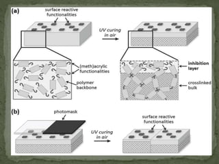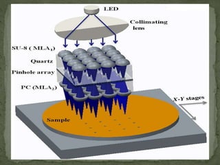 The document discusses various lithography techniques. It begins with an introduction and overview of lithography and its history. It then describes several types of lithography techniques such as electron beam lithography, ion beam lithography, x-ray lithography, and nanoimprint lithography. The document also outlines the typical steps used in lithography processes. Finally, it provides more details on several emerging lithography techniques such as beam pen lithography, nanomotor lithography, coaxial lithography, and oxygen inhibition lithography.