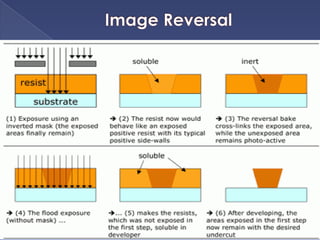 The document describes the process of fabricating integrated circuit (IC) chips. There are several key steps: lithography is used to transfer circuit patterns onto silicon wafers through photomasks, and oxidation, deposition, ion implantation, and etching are carried out to build up the transistor layers. Projection lithography is the dominant exposure method and involves projecting a reduced image of the photomask onto the wafer through a lens system to achieve high resolution needed for modern chips. Positive photoresist is commonly used and becomes soluble when exposed to light, allowing developed areas to be etched. The fabrication process layers and patterns all the necessary circuit elements and interconnects on a single substrate to produce an operational IC.