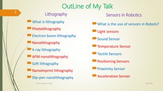 This document outlines Dr. P. Senthilkumar's talk on various lithography techniques. It begins with an introduction to lithography, then discusses specific techniques like photolithography, electron beam lithography, nanolithography, and x-ray lithography. For photolithography, it provides detailed steps including wafer cleaning, photoresist application, exposure, development, and etching. It also discusses applications of lithography in microelectronics fabrication.