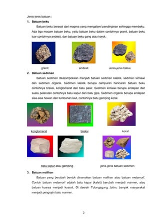 Dokumen ini membahas lithosfer, termasuk struktural, jenis batuan, dan proses yang membentuk permukaan bumi melalui tenaga endogen dan eksogen. Lithosfer adalah lapisan terluar bumi yang terdiri dari berbagai jenis batuan, dan proses pembentukan bumi dijelaskan melalui vulkanisme, tektonisme, dan bentuk-bentuk permukaan lainnya. Selain itu, dokumen ini juga mencakup pengertian gempa bumi dan faktor-faktor yang menyebabkannya.
