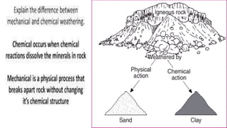 The document discusses the lithosphere and soil, explaining the etymology and significance of the terms. It details the processes of soil formation, including weathering types (physical, chemical, biological) and the major factors influencing soil development such as parent material, climate, topography, living organisms, and time. Additionally, it highlights how these factors interact to create different soil types and characteristics across various environments.