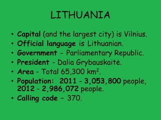 This document provides an overview of Lithuania, including its capital city Vilnius, official language of Lithuanian, and government as a parliamentary republic. It also summarizes some aspects of traditional Lithuanian culture such as popular foods like didžkukuliai and šaltibarščiai, unique folk music forms like sutartinės, influential composer Mikalojus Konstantinas Čiurlionis, and regional traditional clothing styles.