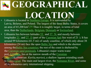 Lithuania is located in Northern Europe, bordered by Latvia, Belarus, and Poland. It has a population of around 2.9 million, with Lithuanian as the official language. The capital and largest city is Vilnius. Lithuania has a mostly temperate climate and a long history and culture with influences from Catholicism and the Polish-Lithuanian Commonwealth. Some of Lithuania's most popular tourist attractions include the Hill of Crosses, Palanga beach, Gediminas Castle, and the Vilnius Cathedral.