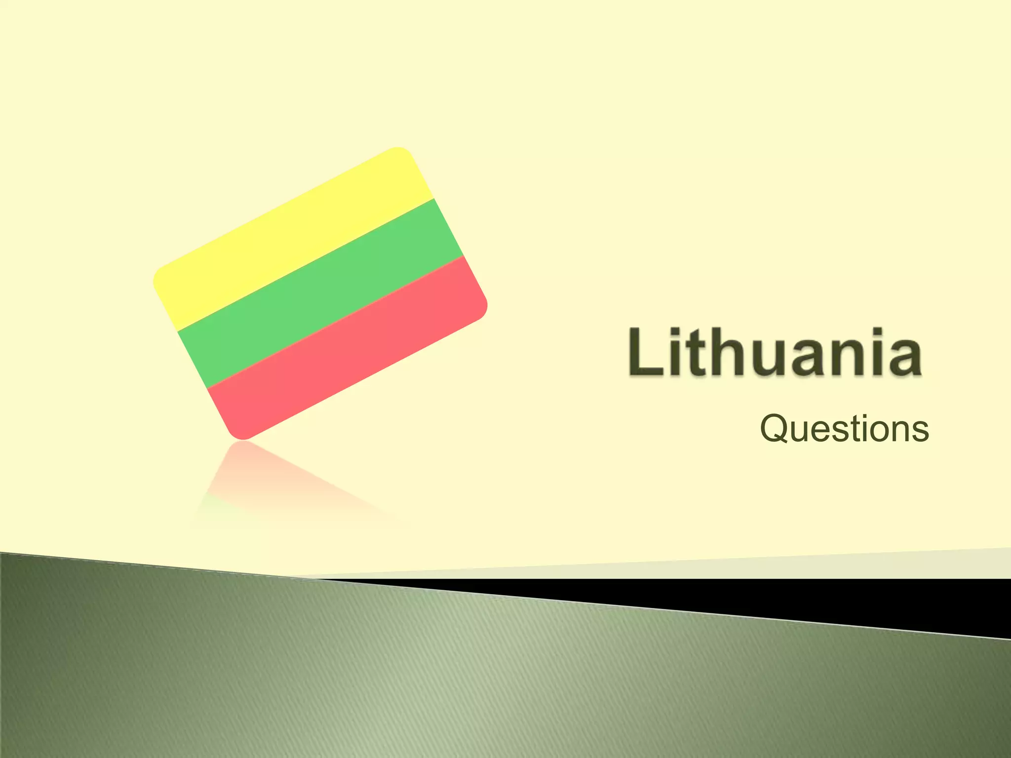 The document contains a series of 21 yes or no questions about Lithuania and its people. The questions cover topics such as the president, EU membership, infrastructure, education, cuisine, geography, capital city, culture, and lifestyle. Respondents are prompted to answer yes or no to each individual multiple choice question.