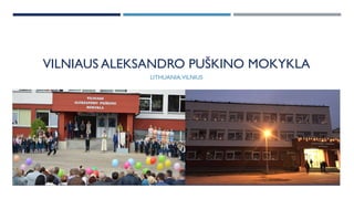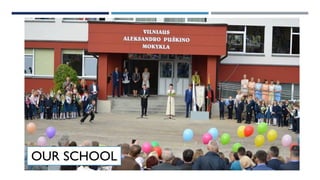 The document summarizes upcoming events at Vilnius Aleksandro Puškino Mokykla in Lithuania. It describes that the school is named after famous Russian writer Alexander Pushkin and lists upcoming events including a 19th century style ball on October 19th to honor Liceum Day, a talent show, sports activities, and a STEAM science night. It concludes by welcoming others to the school in the future and wishing everyone a wonderful time in the project.